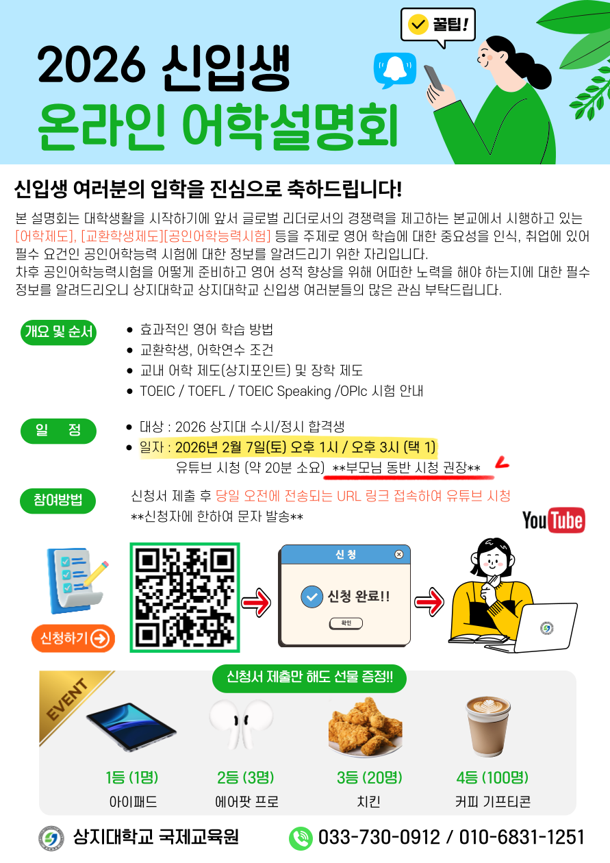 [국제교육원] 2026 신입생 토익특강 온라인 어학설명회 새글