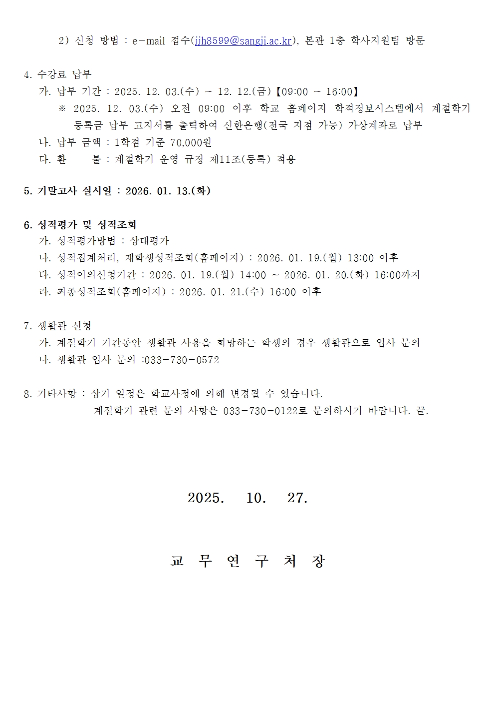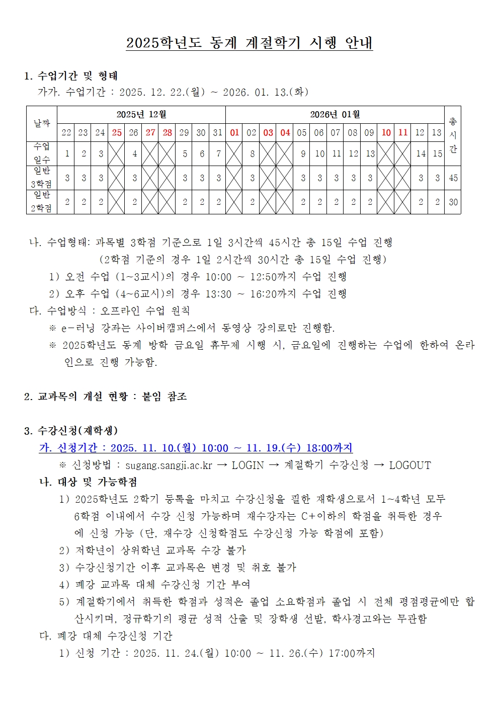 2025학년도 동계 계절학기 시행 안내