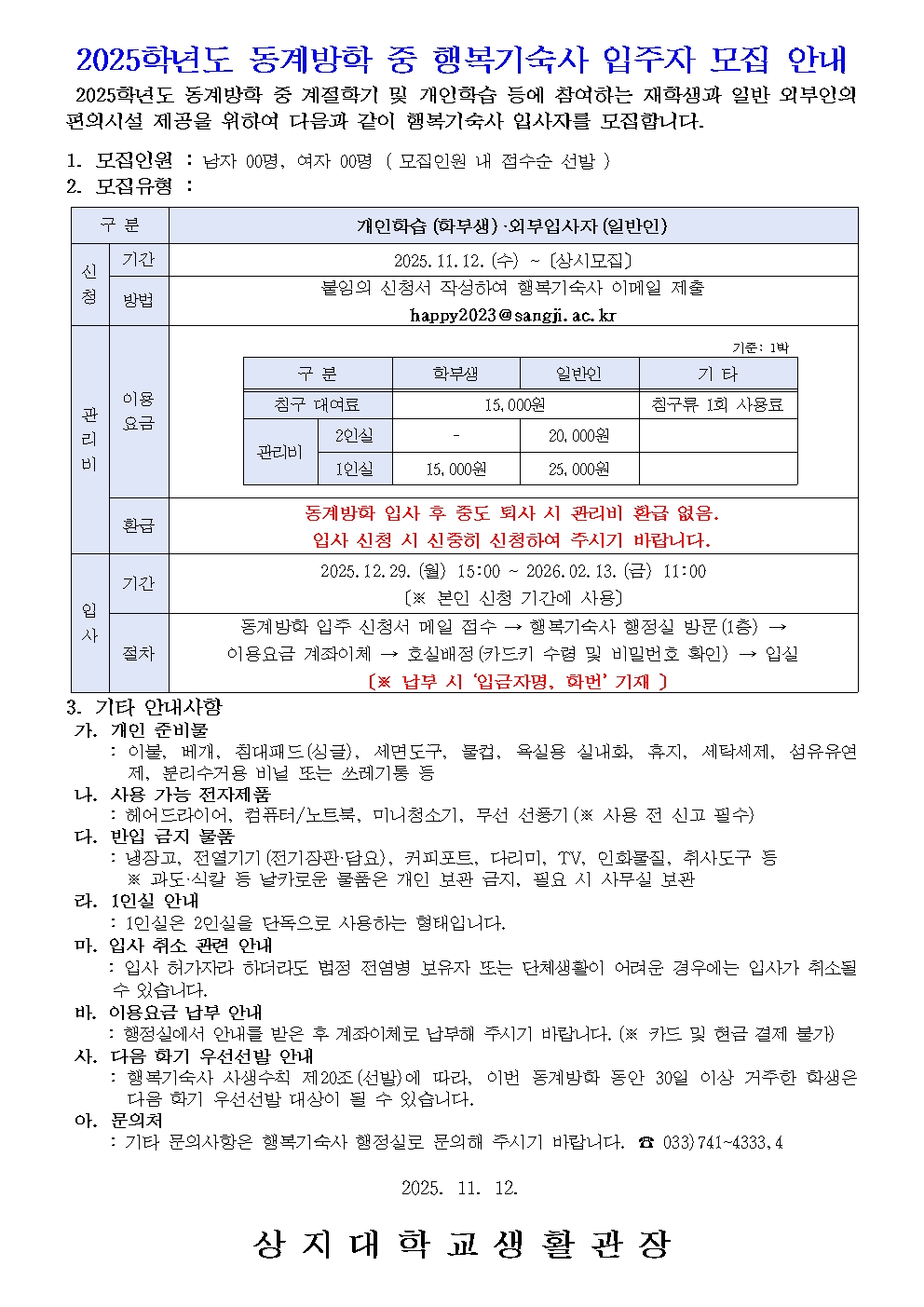 2025학년도 동계방학 중 행복기숙사 입주자 모집 안내 [행복기숙사]